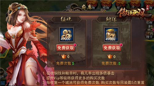 “有钱能使鬼推磨,无钱寸步也难行。”无论在现实世界还是游戏世界,钱都是极为重要的存在,想获得钱就要付出等价的劳动和努力,天下没有天上掉馅饼的事。但……是!360《傲视无双》却可以帮你实现“空手套白狼”的愿望。玩家可在府库系统中征收银两及铜钱,每收复一个城池,即可获得一次免费征收的机会,VIP还可以获得更多的征收次数!