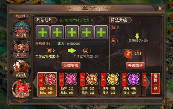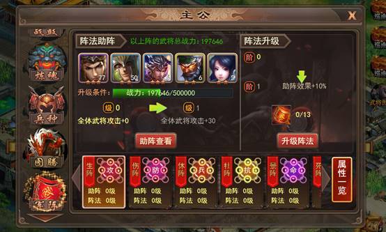 阵法布阵需要主公自己去排兵布阵了,如果主公想快速增加战力,让战力突飞猛进的话,建议优先把主队放在休阵,该阵法主加兵力,兵力增加是游戏里面增加战力最快的途径哦!根据不同的战力,阵法助阵会有不同的等级,并且有不同的属性加成,最高为100级助阵等级,战力需求为5000W。