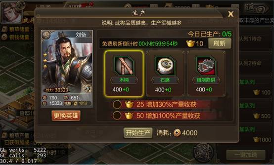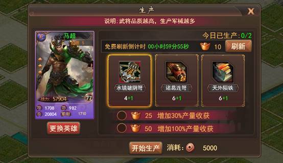 在工匠坊中可生产武将训练材料,生产时需放入执行武将,执行武将品质越高,生产出的材料越多,升级工匠坊可提升材料品质及生产数量