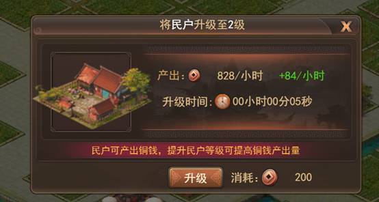 民户与商铺可产出铜钱,升级建筑可提升铜钱产出量