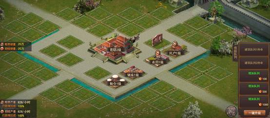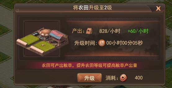 农田与牧场可产出粮草,升级建筑可提升粮草产出量