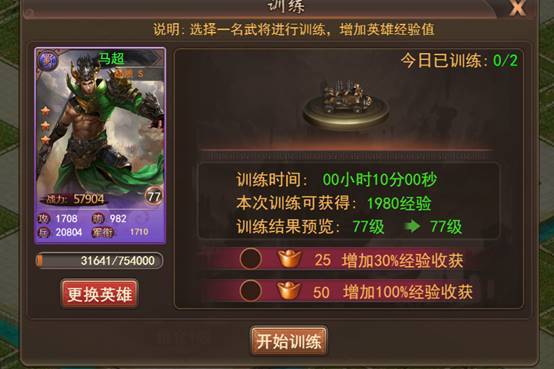 校场中可进行武将训练,训练完毕后该武将可获得大量升级经验,升级校场可提升经验获取量