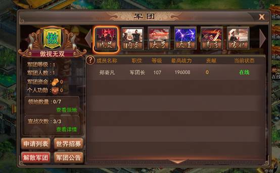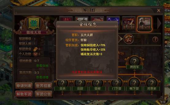 当军团占领了指定数量的城池之后,即可开启等级的官职,军团长可手动任命军团内成员担任官职