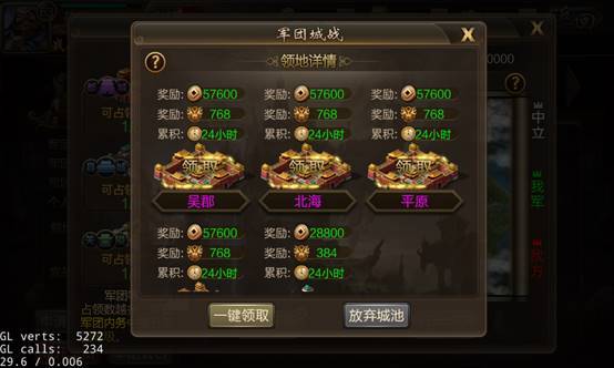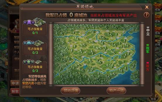 加入军团之后,攻陷其他城池且满足占领条件时,该城池将成为本军团领地。领地城池可产出铜钱及功勋资源,在领地功能中可查看领取领地奖励。