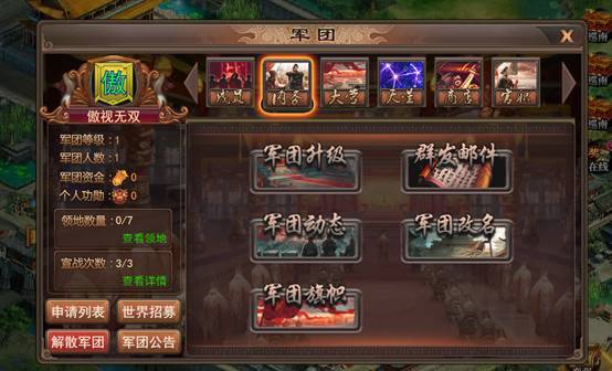 军团长在军团内务中可进行军团升级、群发邮件、军团改名及修改军旗等操作