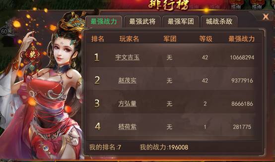 排行榜共有4项分组,分别为:最强战力、最强武将、最强军团、城战杀敌,每项分组军队对应展示本服数据最强的前50名玩家。